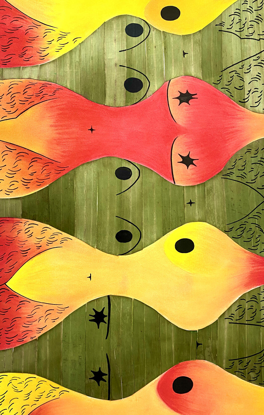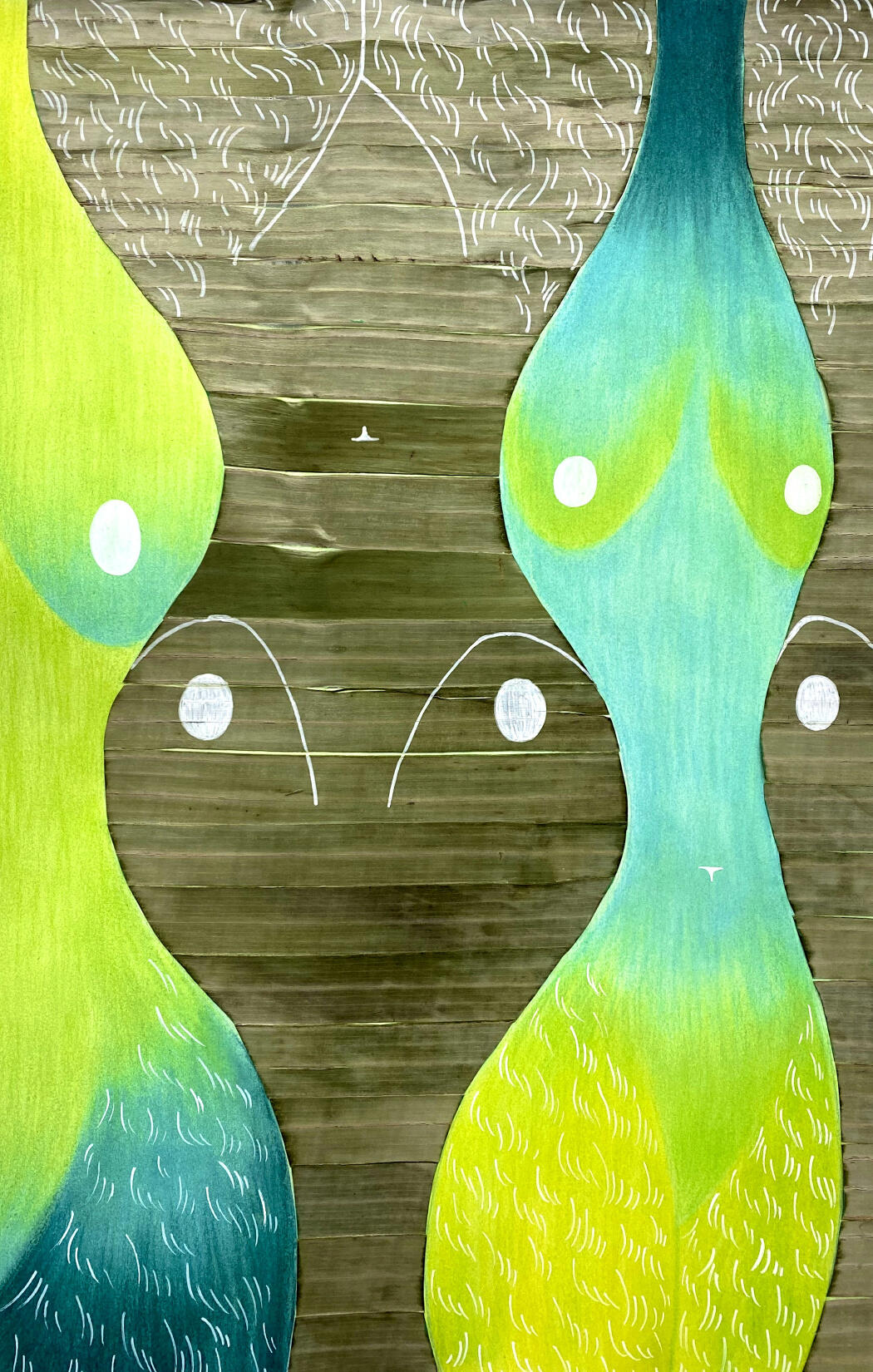Ampalaya, 2023 Vietnamese handmade melon leaf paper, colored pencil, banana leaves 18” x 24”